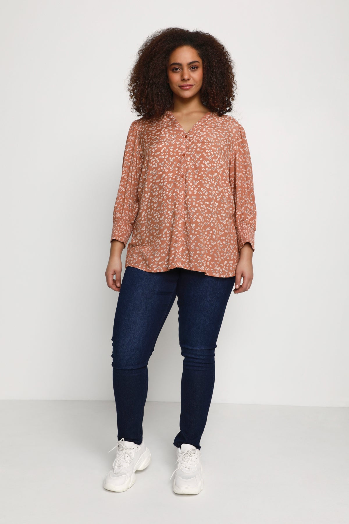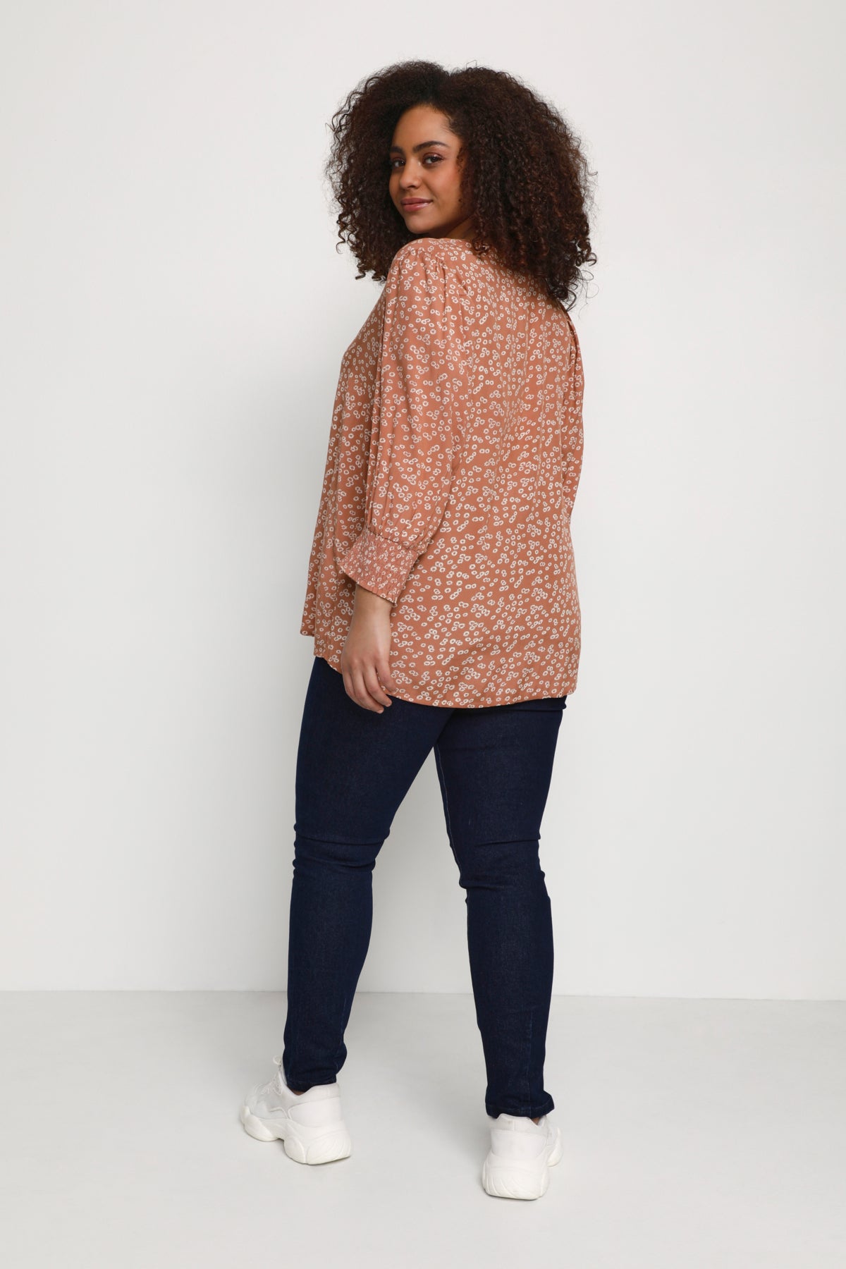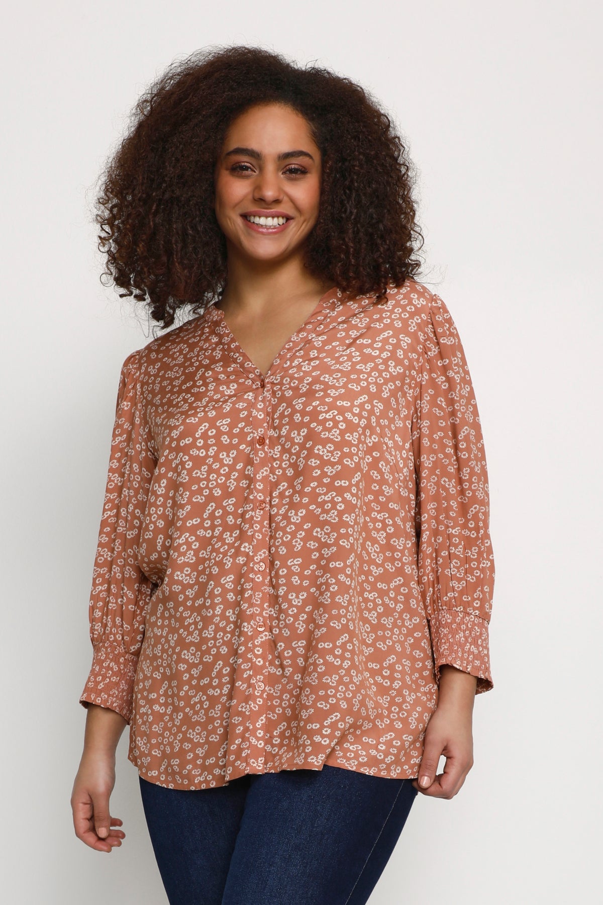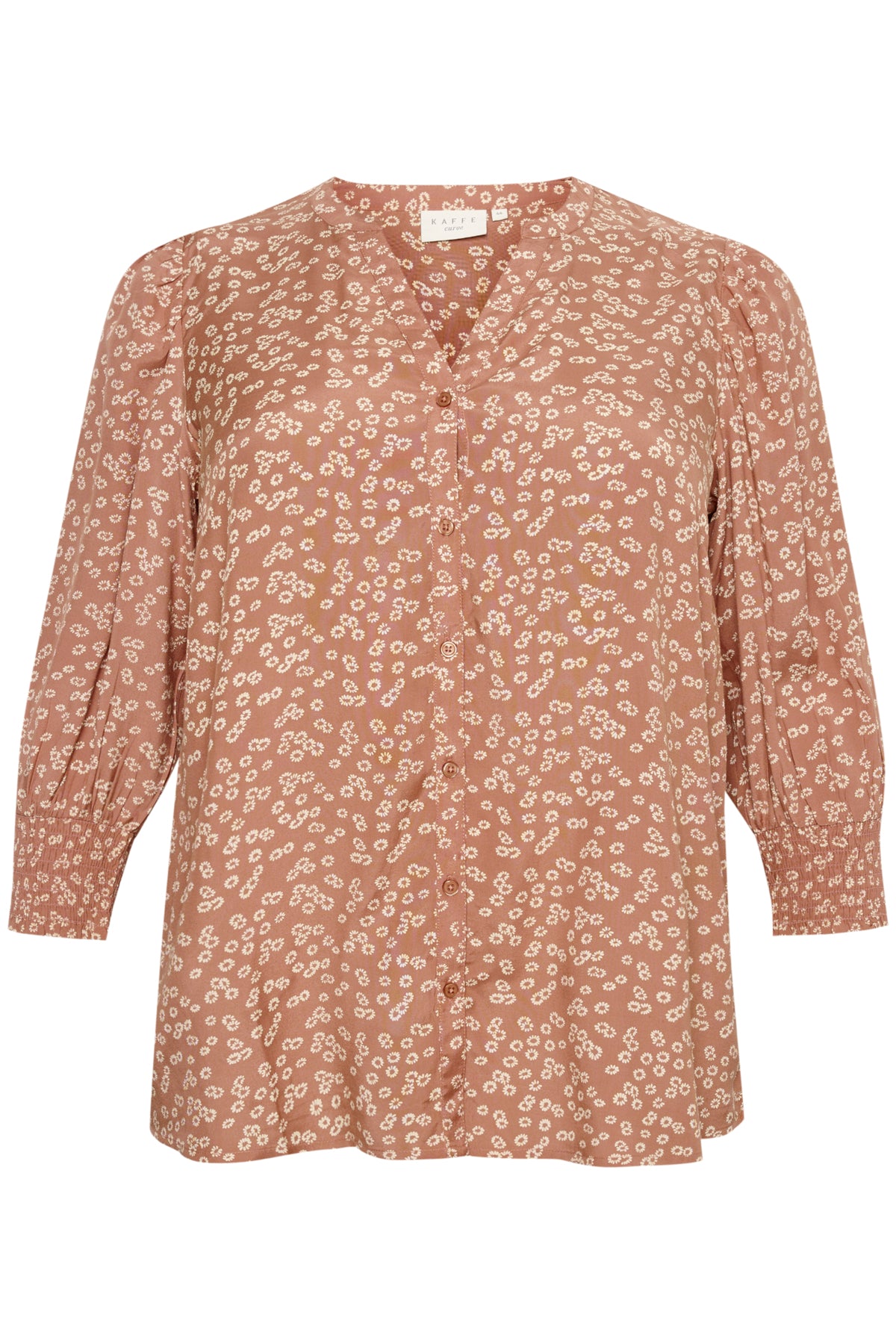 Blússan er ljós rústrauð í grunninn með fínlegu hvítu blómamynstri.