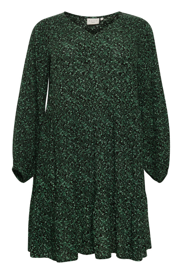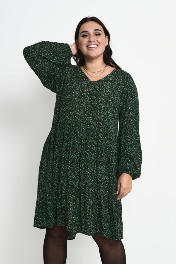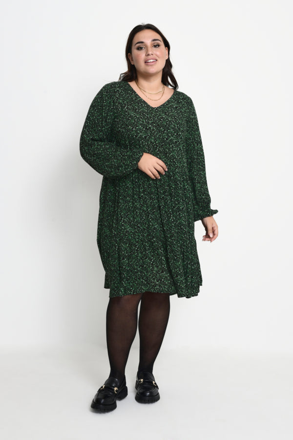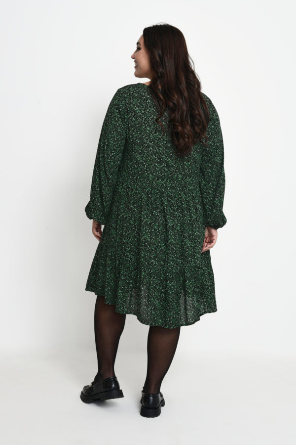 Sniðið á kjólnum sjálfum er laust A-snið með lagskiptu pilsi.Fallega grænn litur í grunninn með smáu svörtu mynstri.