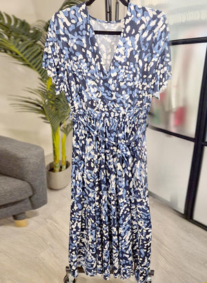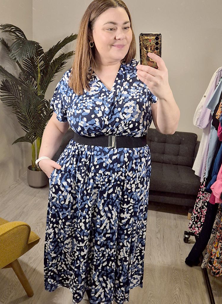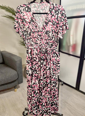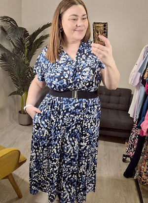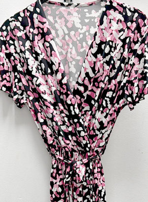 Wrap hálsmál, teygja í mittinu og mjög góð teygja í efninu.