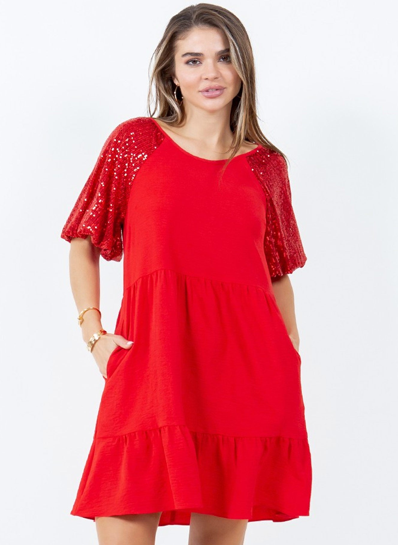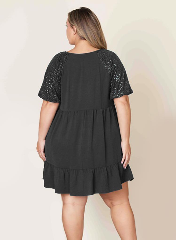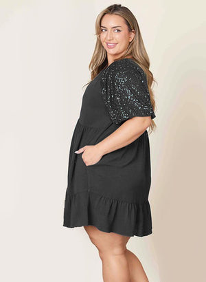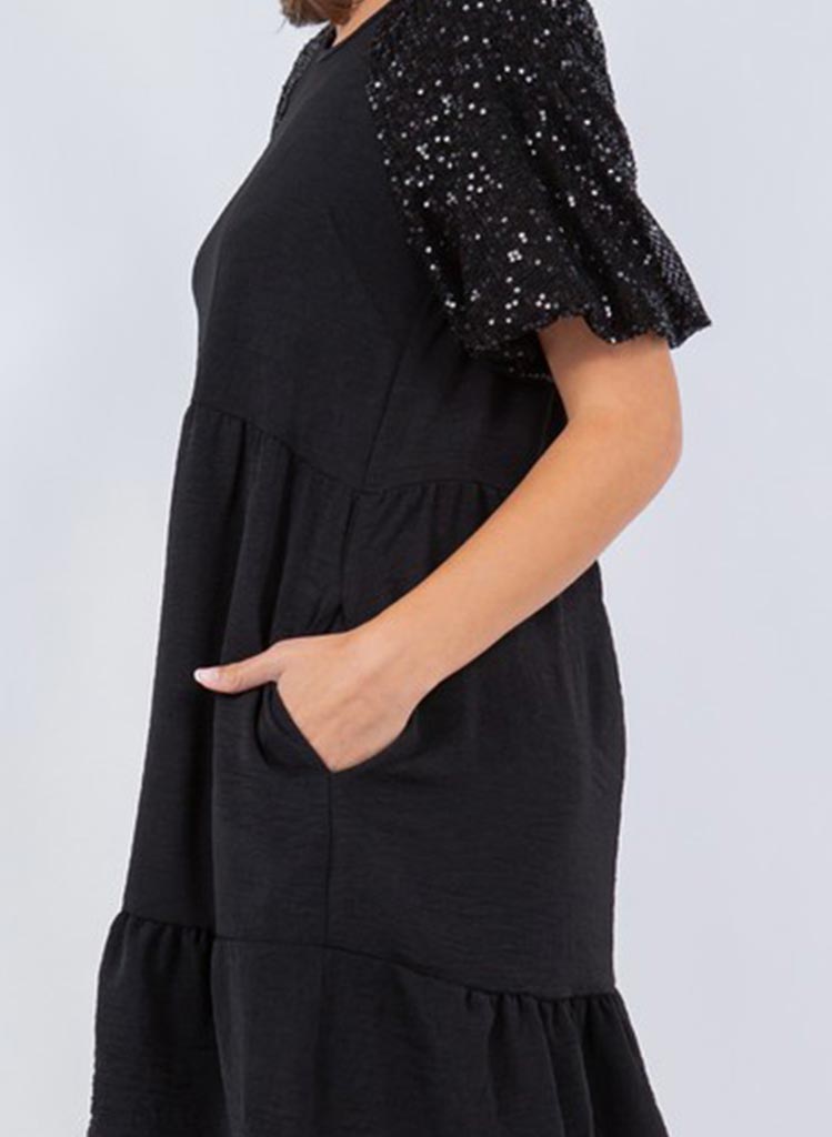 Ermarnar eru þaktar samlita pallíettum sem gerir kjólinn einstaklega sparilegan.