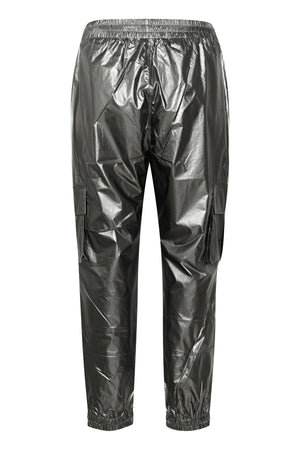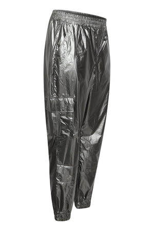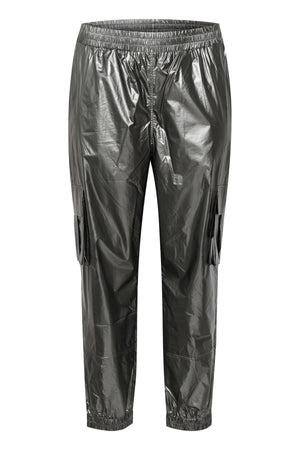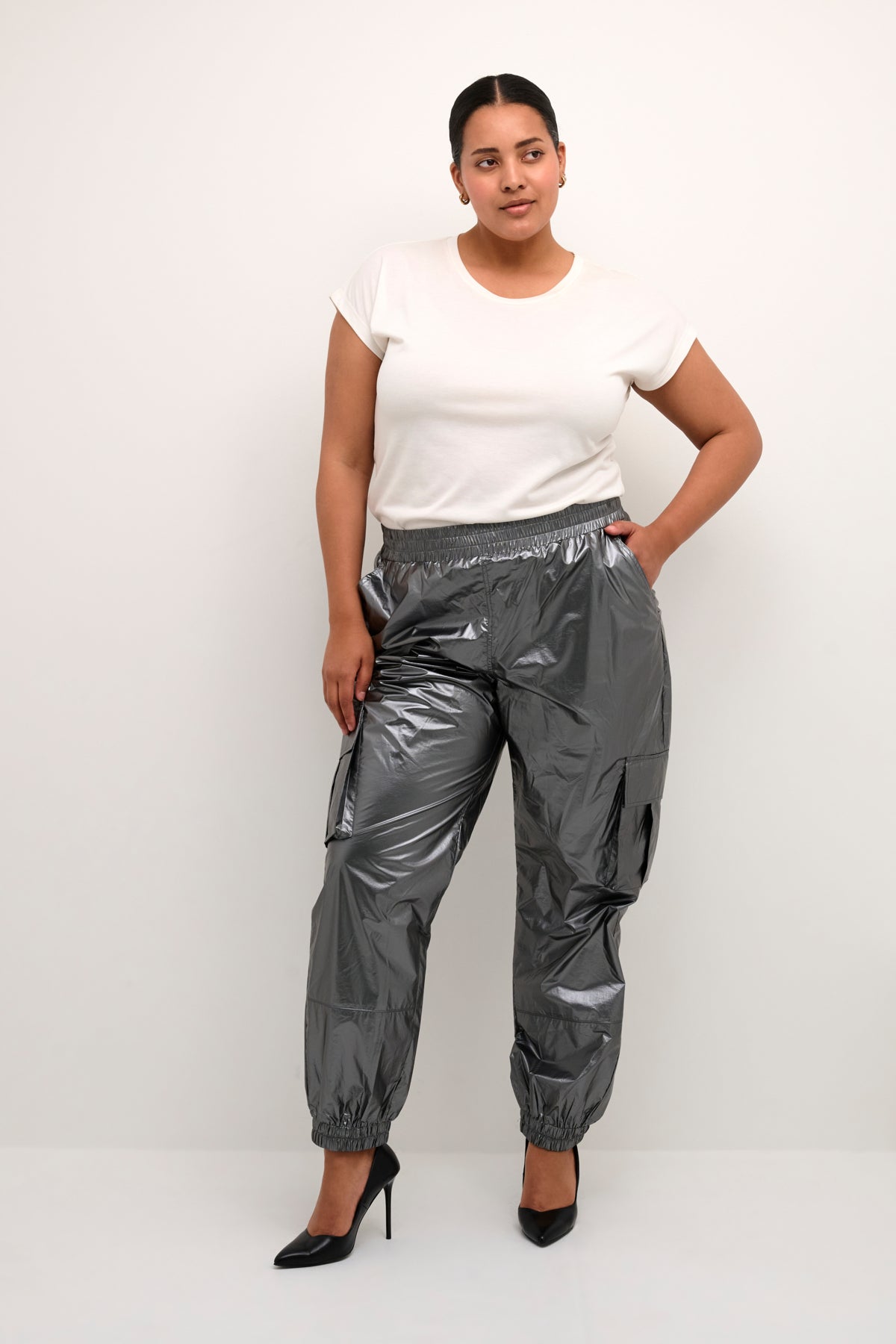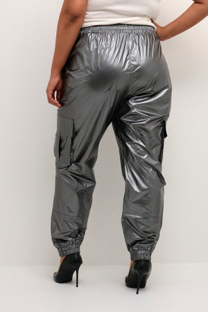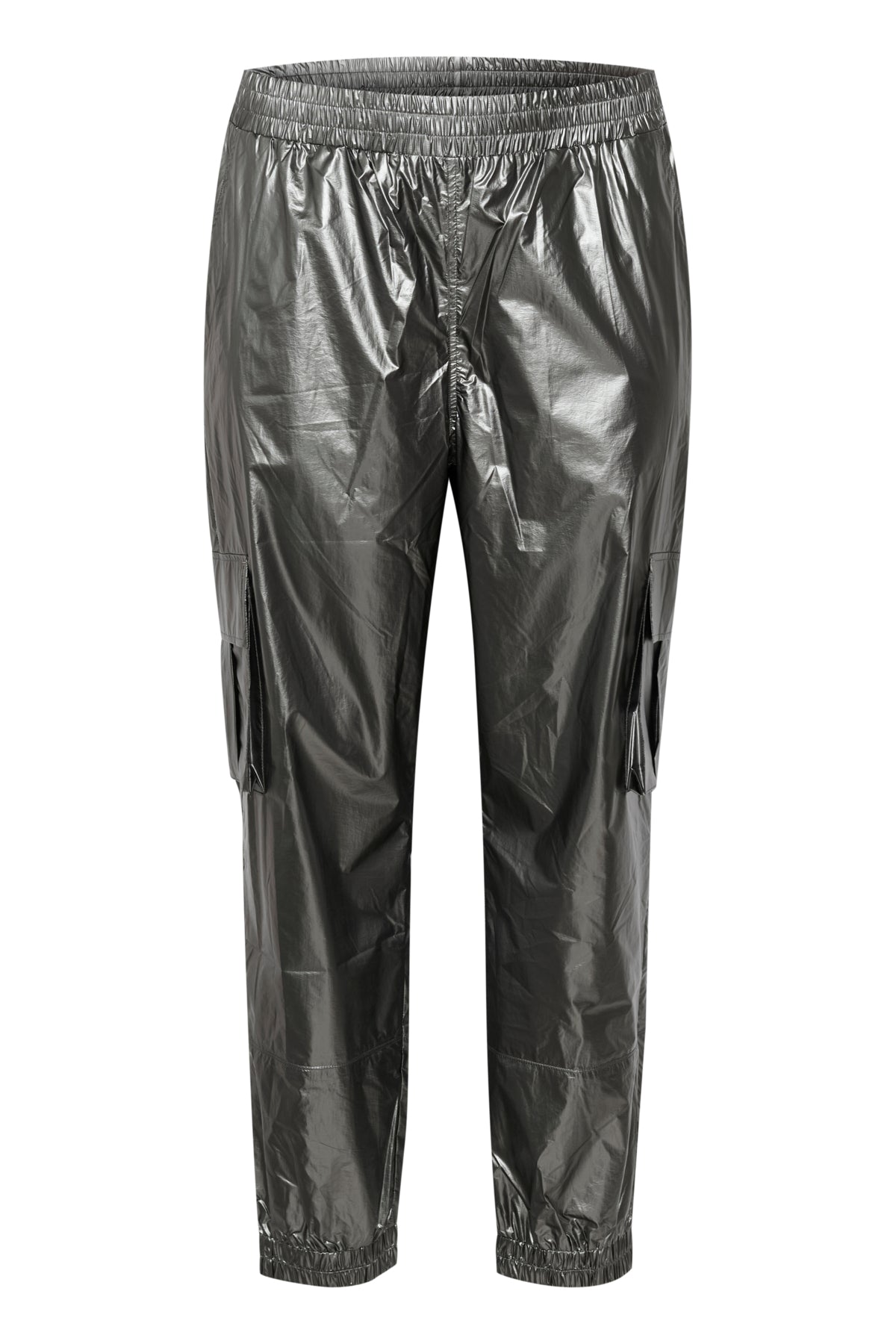 Metallic gráar á litinn léttar með vösum á hliðinni, teygju í mittinu og neðst á skálmunum.