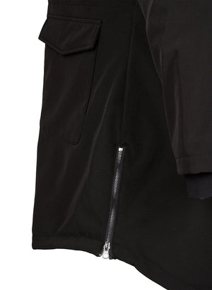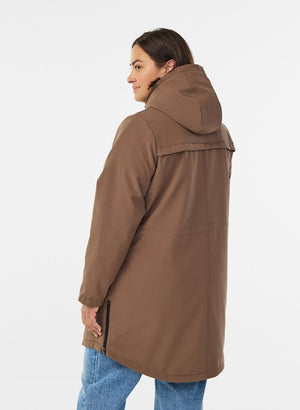 Jakkinn er með parka sniði, tekinn saman í mittið og er því mjög klæðilegur - Hetta er á jakkanum en það er hægt að taka hana af og rennilás á hliðunum svo þú getur stækkað jakkann á hliðunum.