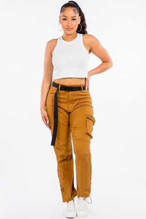 Buxurnar eru háar upp í mittið og fylgir belti með.