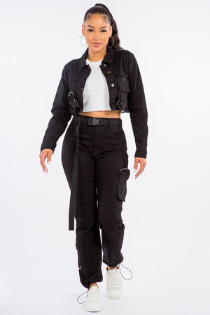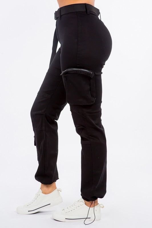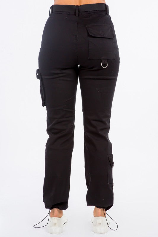 Fjórir vasar á hliðunum, lausar skálmar og teygjubönd neðst á skálmunum sem þú getur rykkt saman.