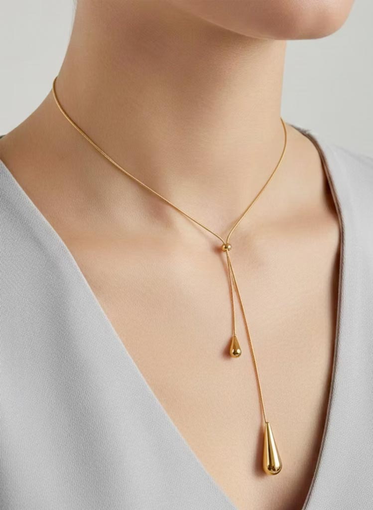 Hálsmen með lengri keðju og tveimur dropum á endanum