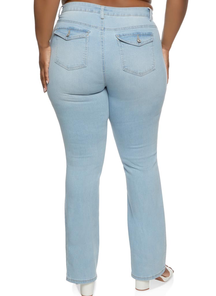 Extra háar, ljósbláar á litinn og bootcut sniði.