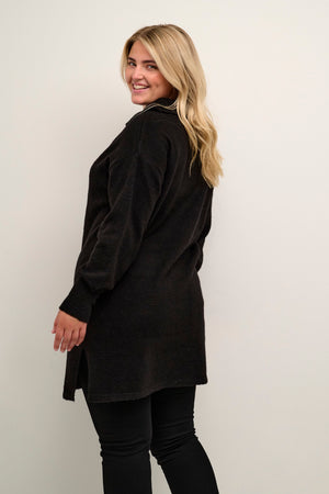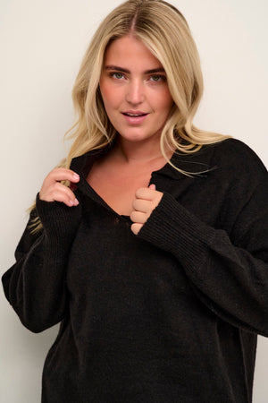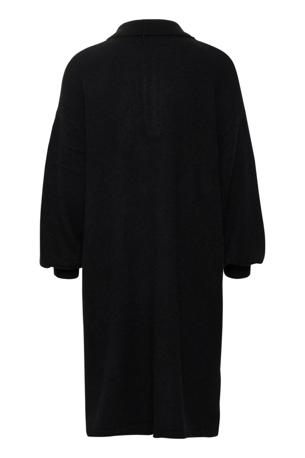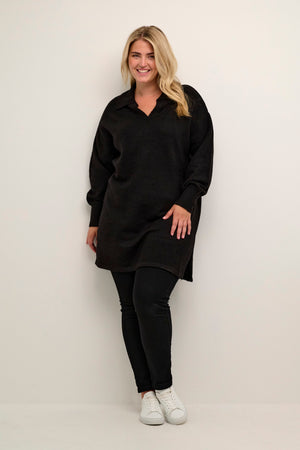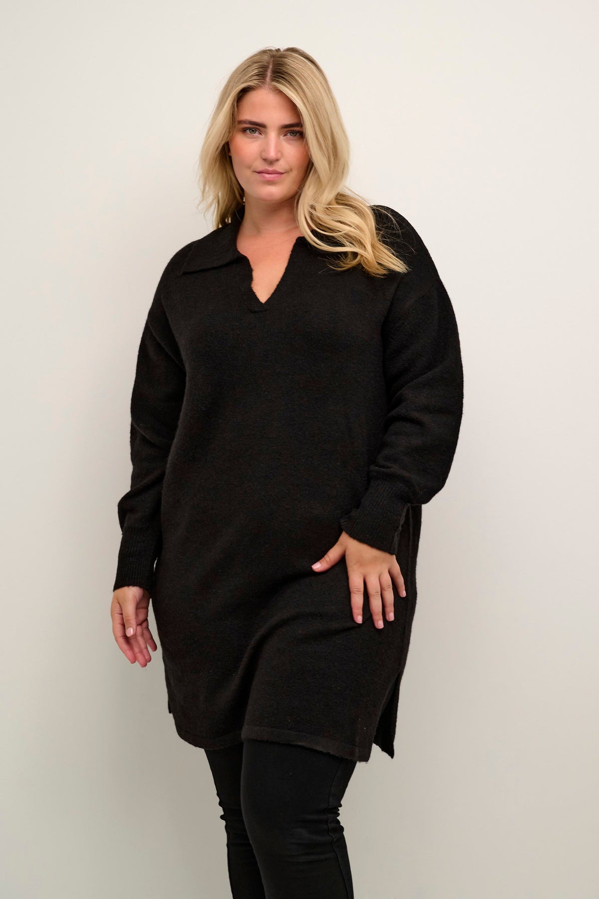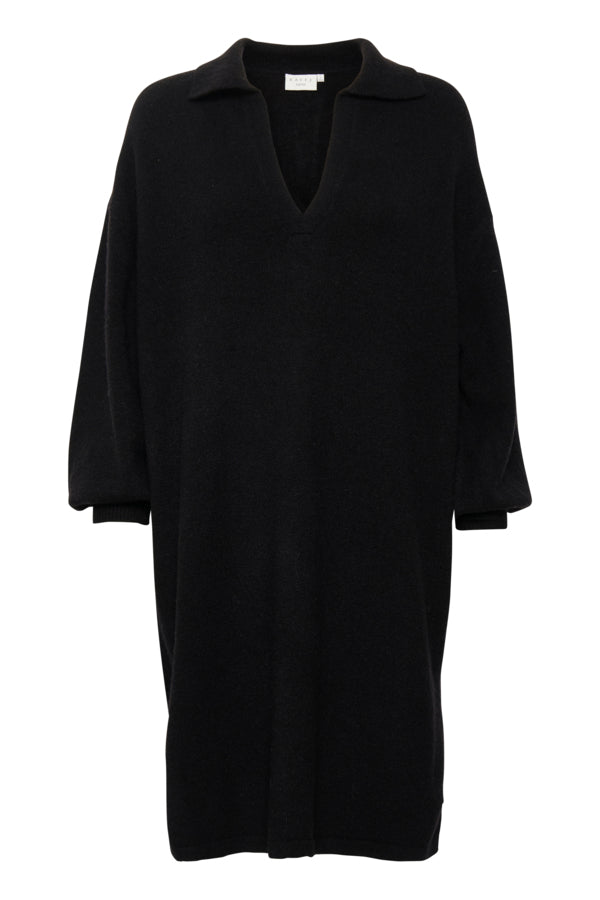 Peysukjóllinn er í lausu beinu sniði og er með kraga og v-hálsmáli.