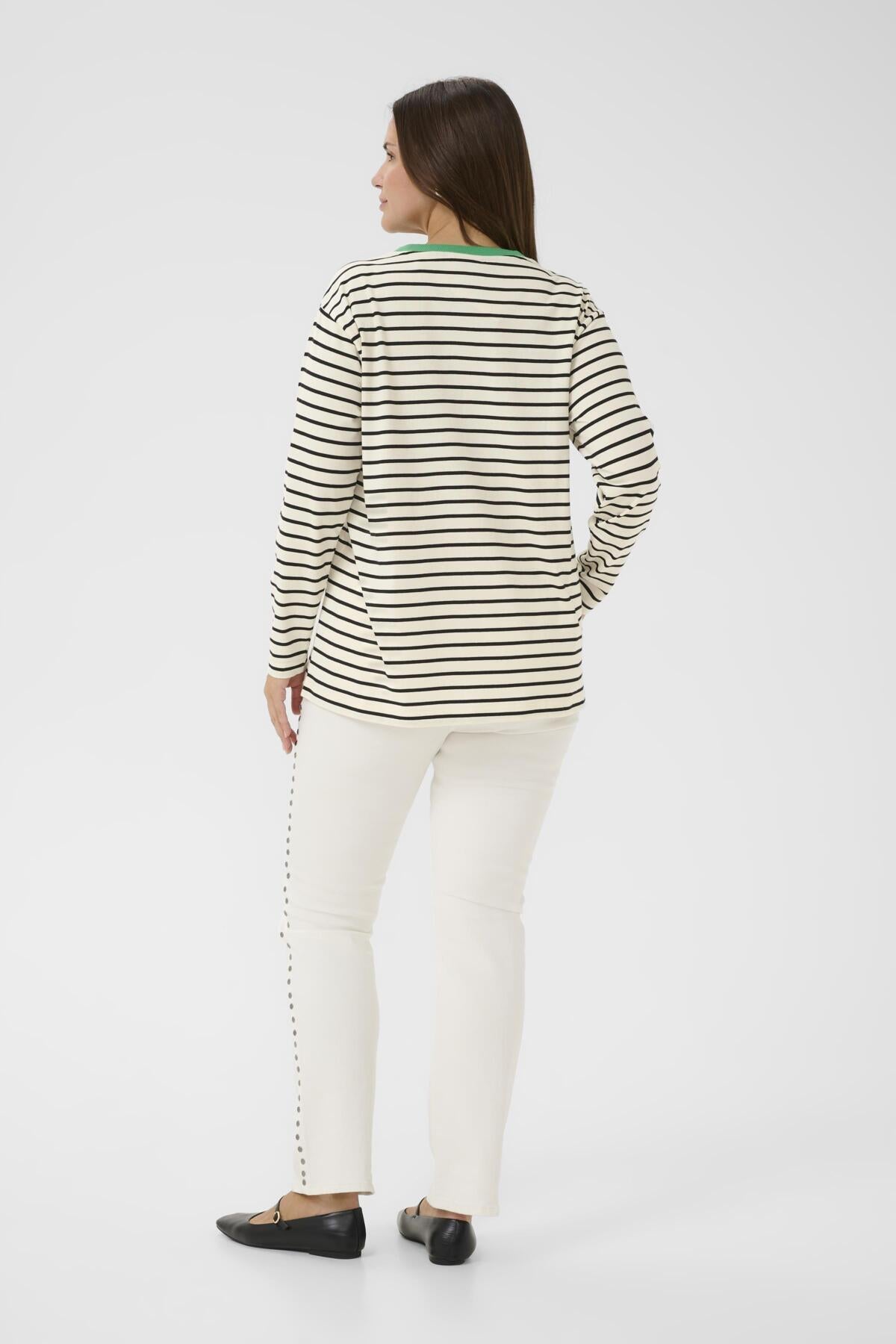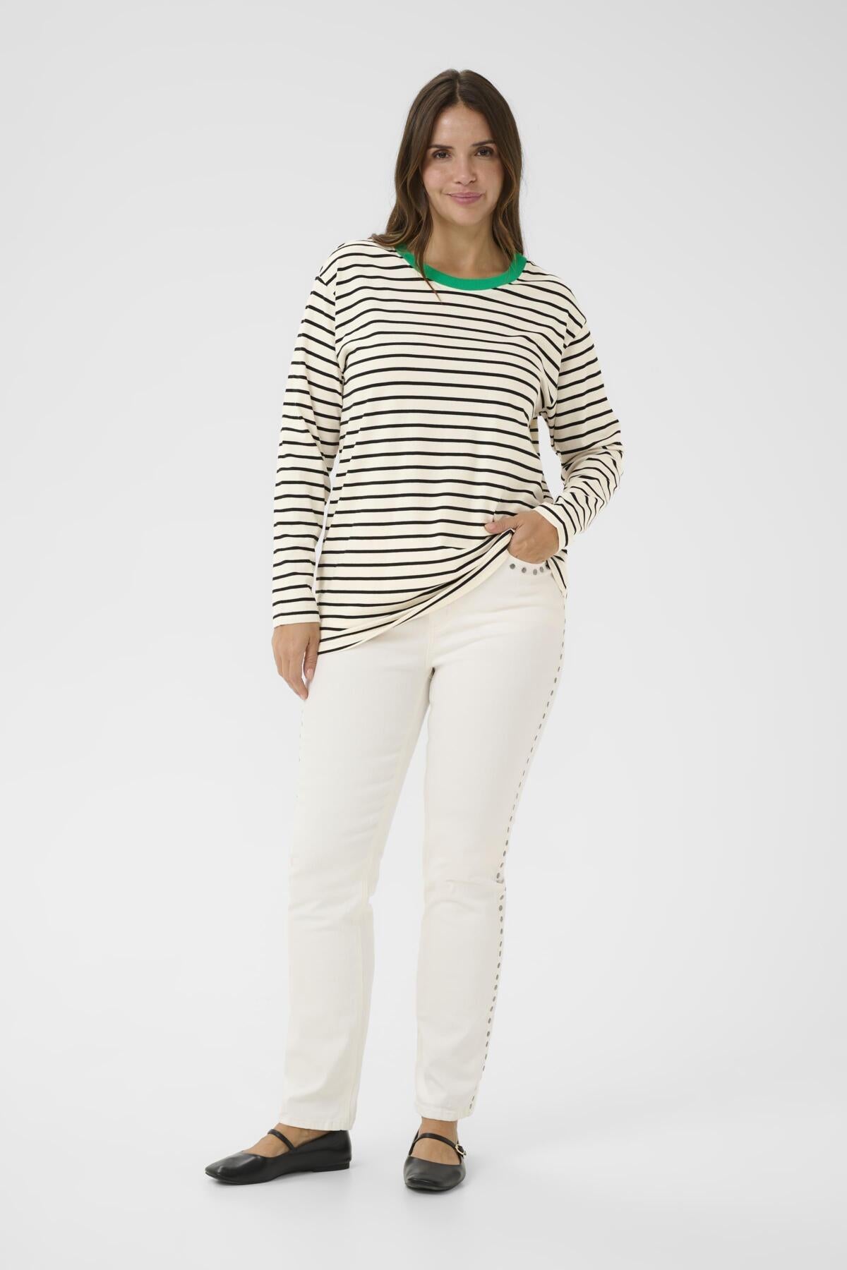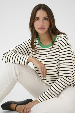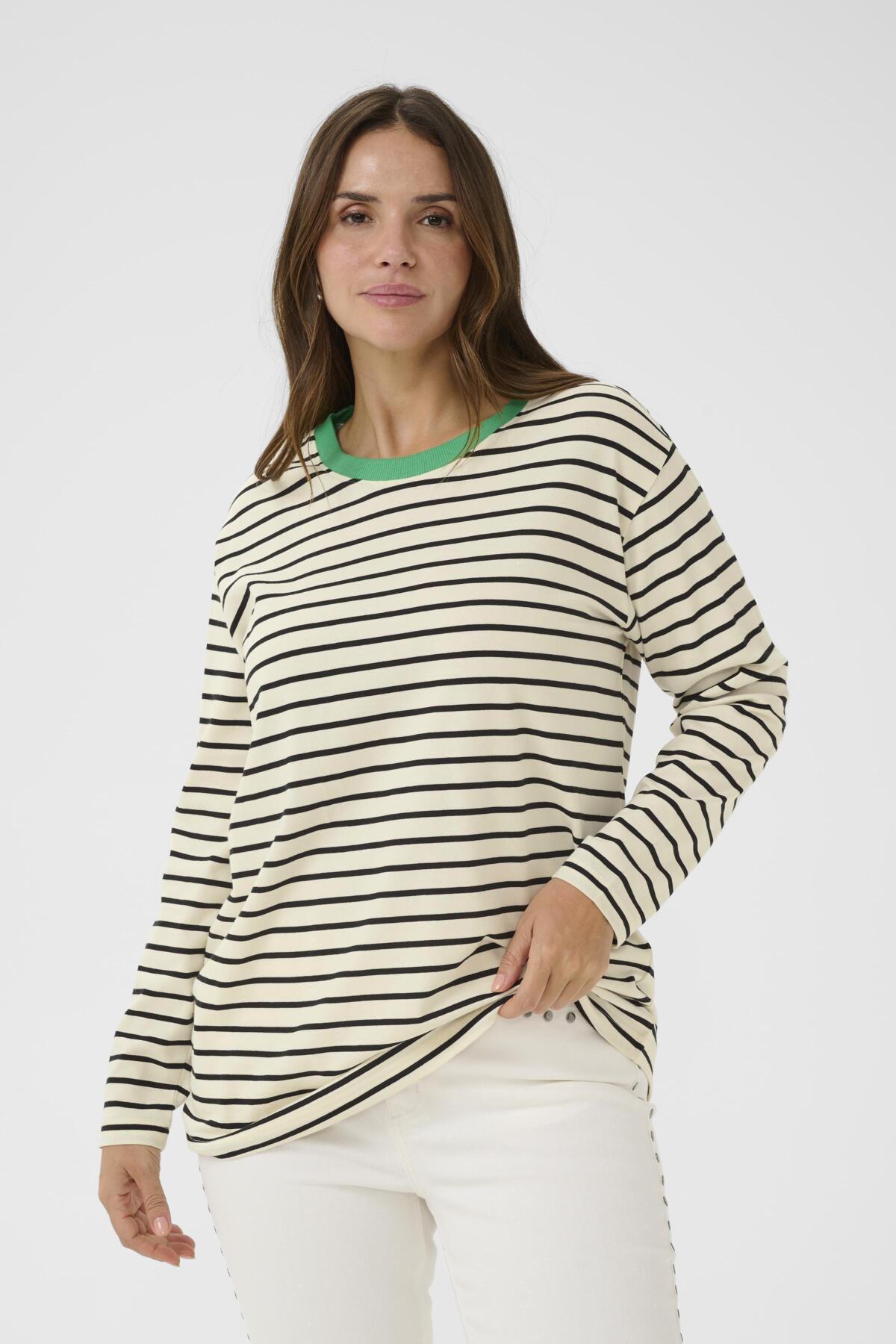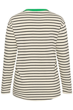 Hvítur, svartur og grænn röndóttur síðerma bolur frá danska merkinu Kaffe Curve.