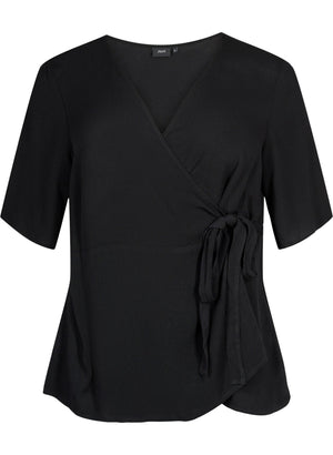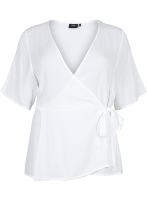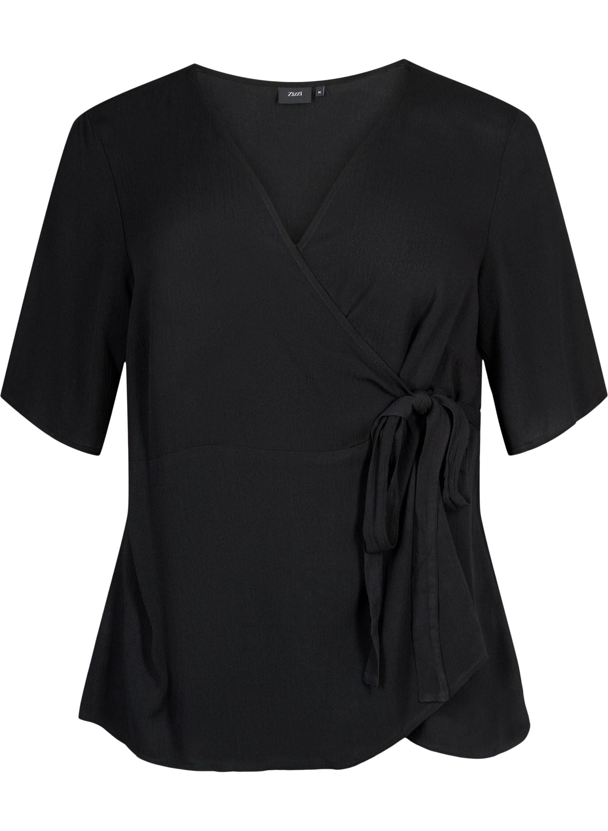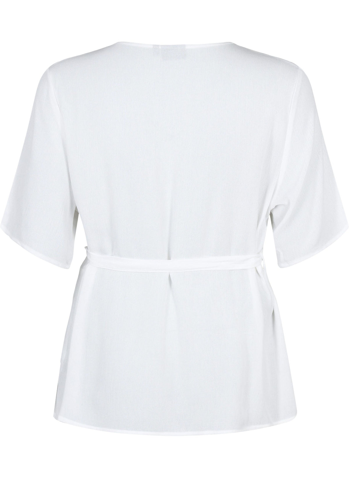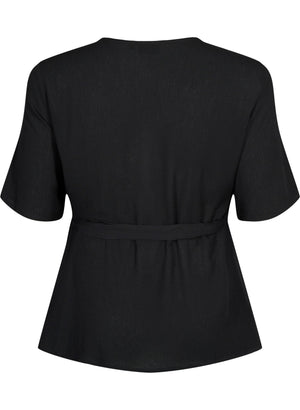 Wrap snið með bandi svo það er hægt að taka blússuna saman í mittinu.