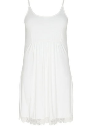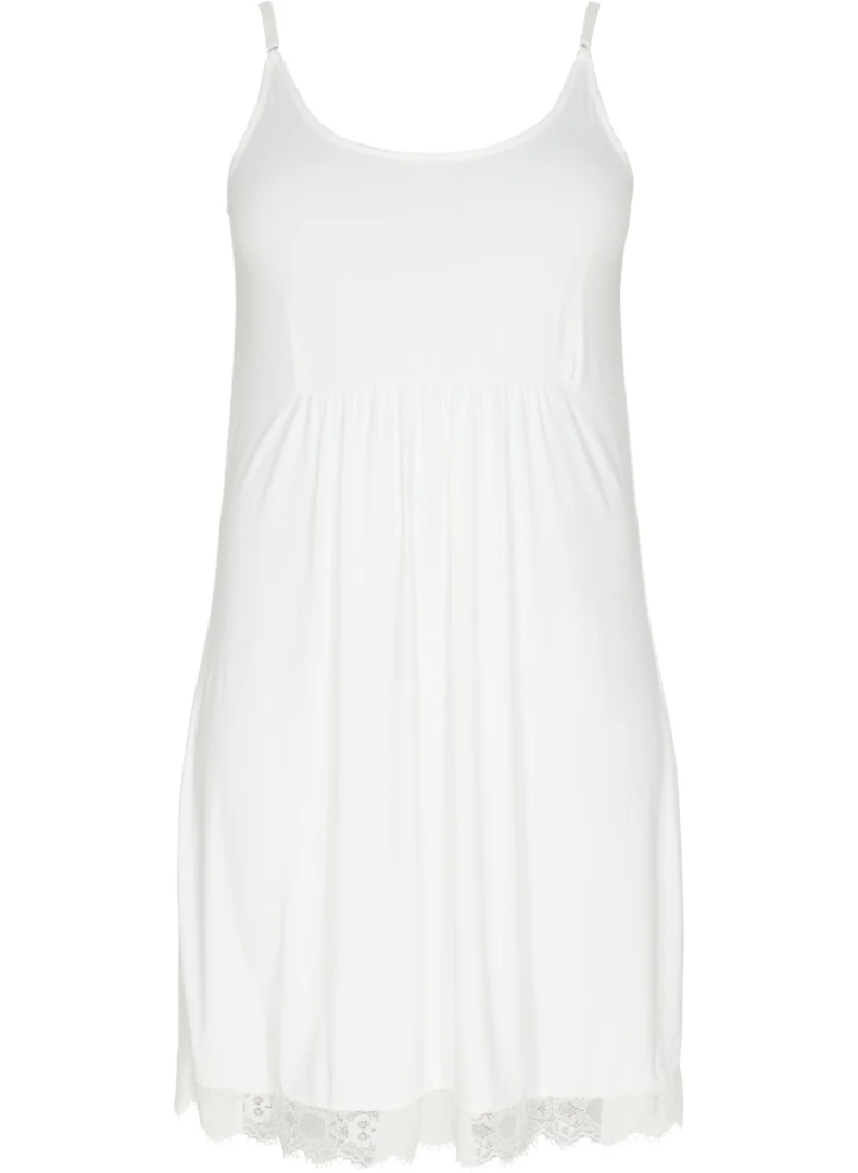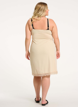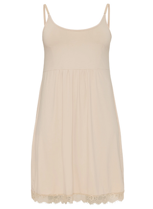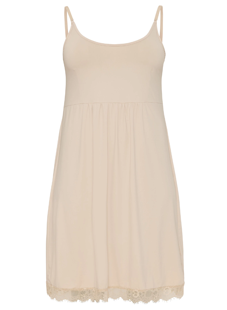 Vandaður og mjög teygjanlegur kjóll með mjóum stillanlegum hlýrum og blúndu neðst.