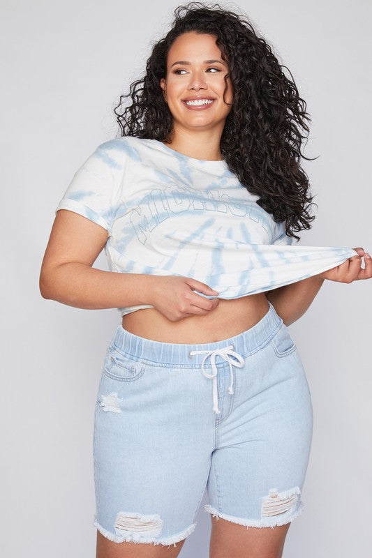 Geggjaðar gallastuttbuxur sem eru extra háar uppí mittið með teygju og reimar.