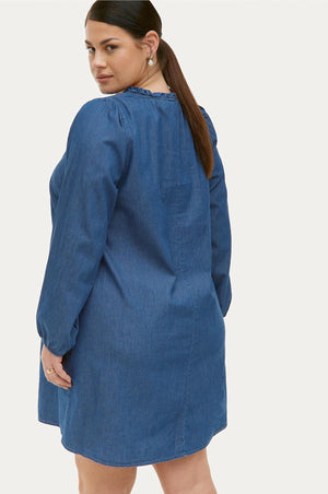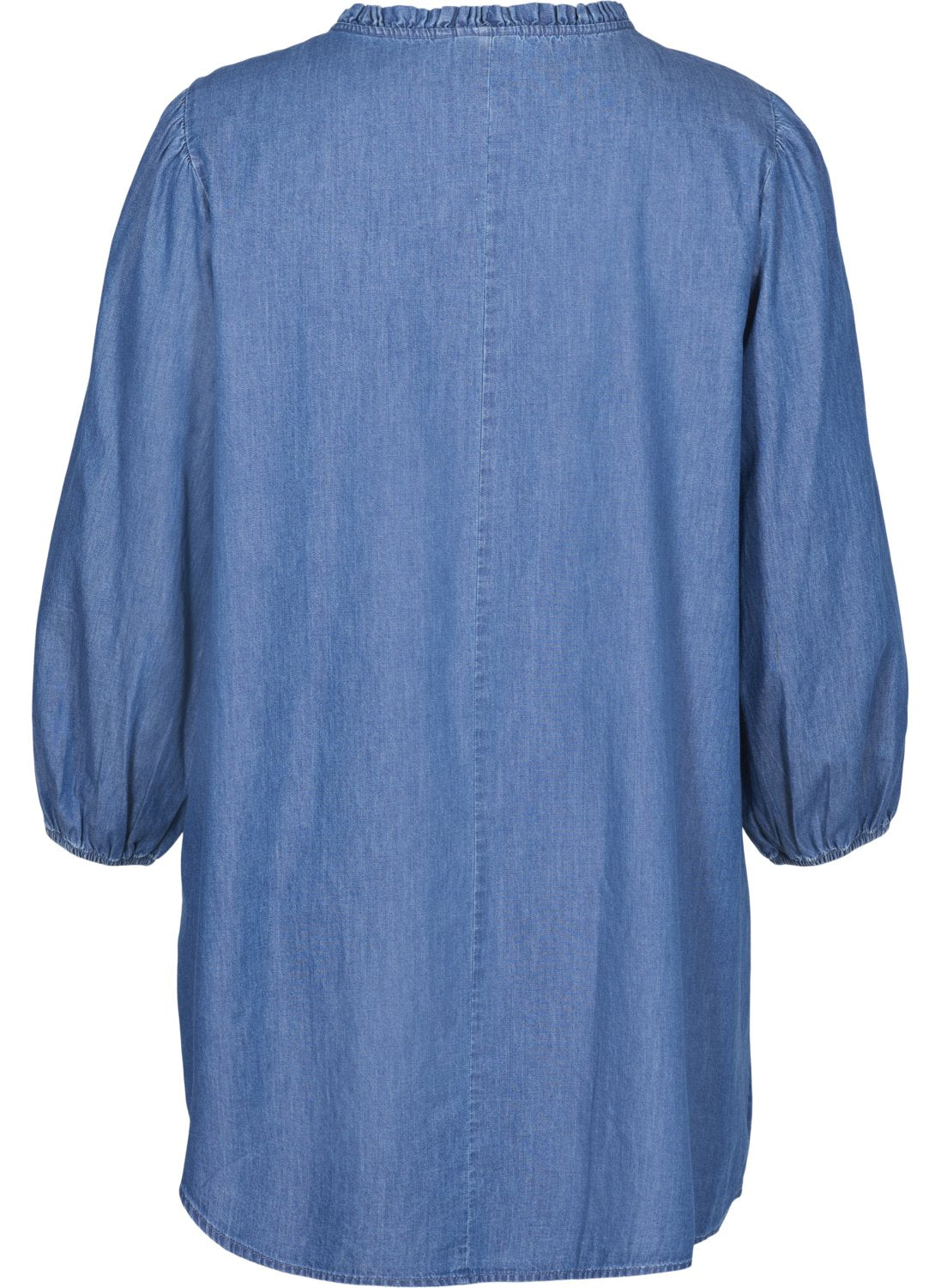 Víðar ermar með teygju að neðan, laust snið og smá pífa til skrauts við hálsmálið.